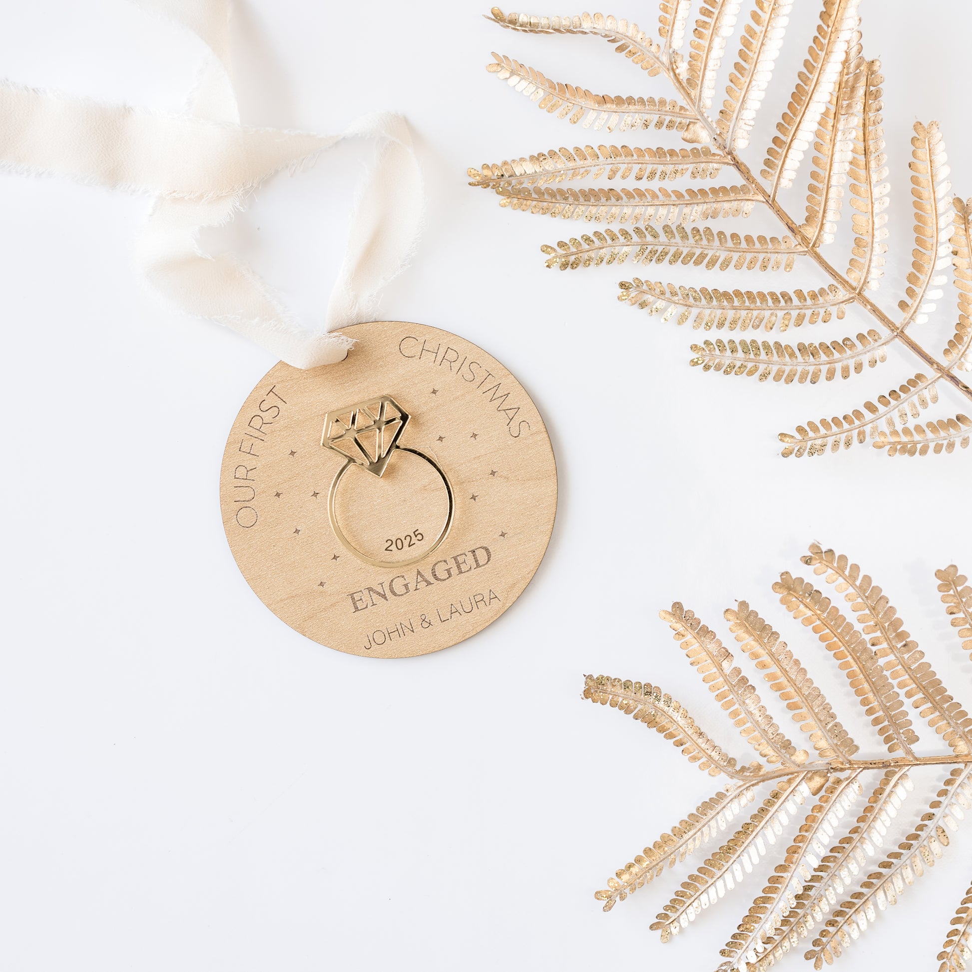 This ornament features the text "Our First Christmas Engaged" as well as the year and is custom engraved with the names of the engaged couple. A mirrored gold acrylic ring is affixed to the ornament. Please include the names to bee engraved in the custom notes section.
