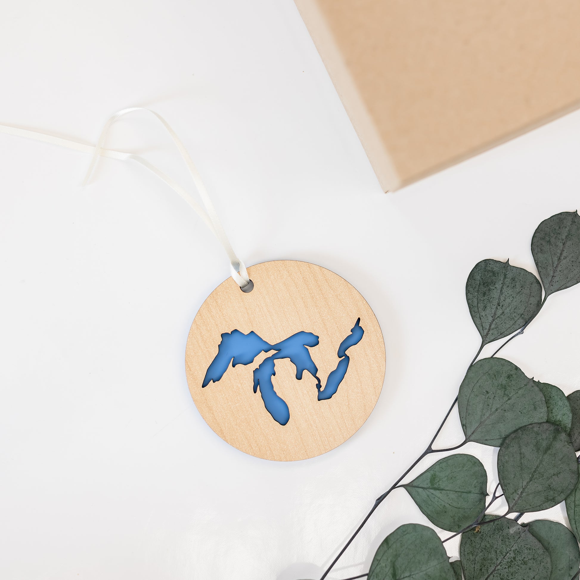A wood and acrylic ornament featuring the Great Lakes - laser cut out of the wood top layer and affixed to a blue acrylic backing.
