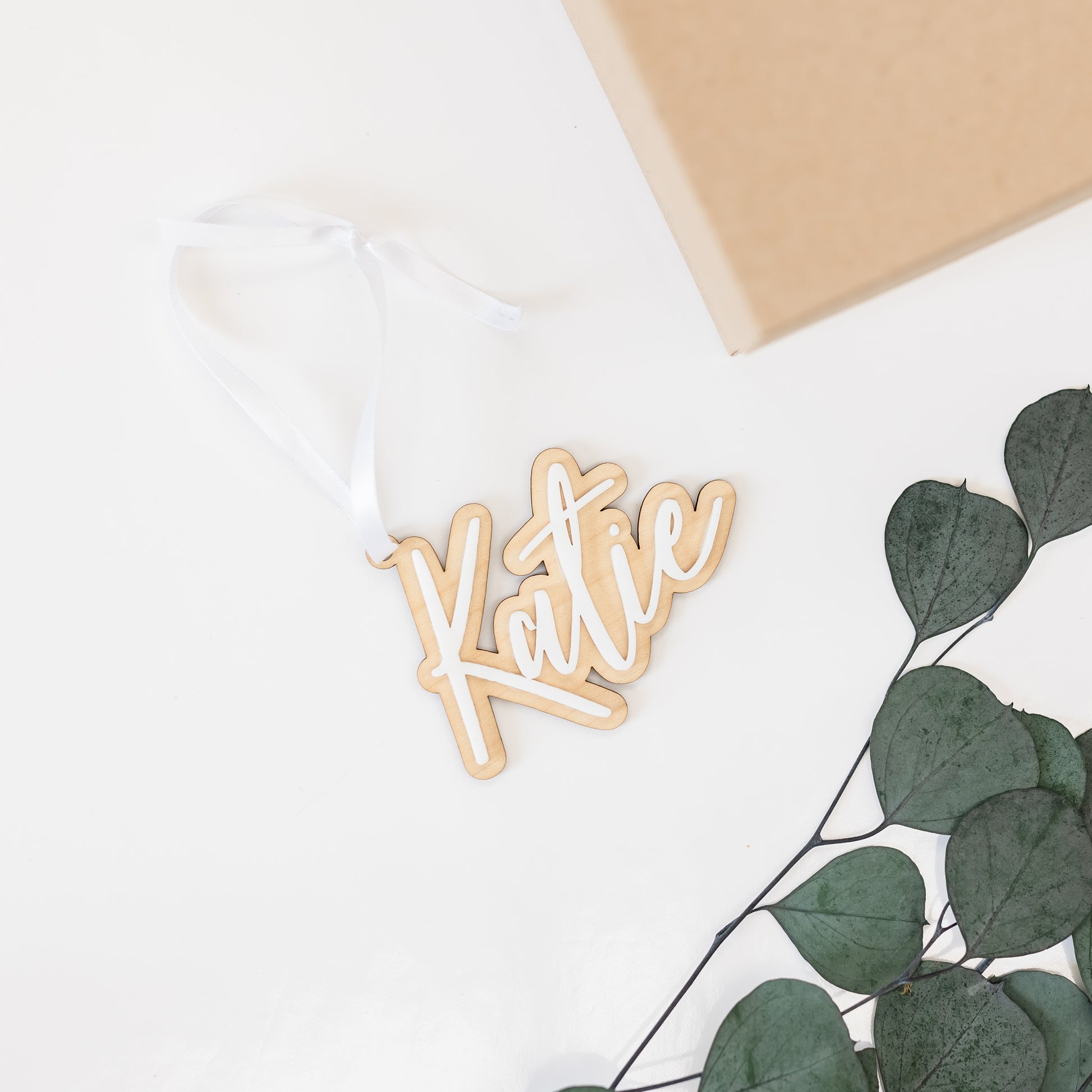 Each name is laser cut out of white acrylic with an enlarged wood cutout of the same name affixed to the back as a border. Please include the name(s) to be laser cut out in the custom note section.