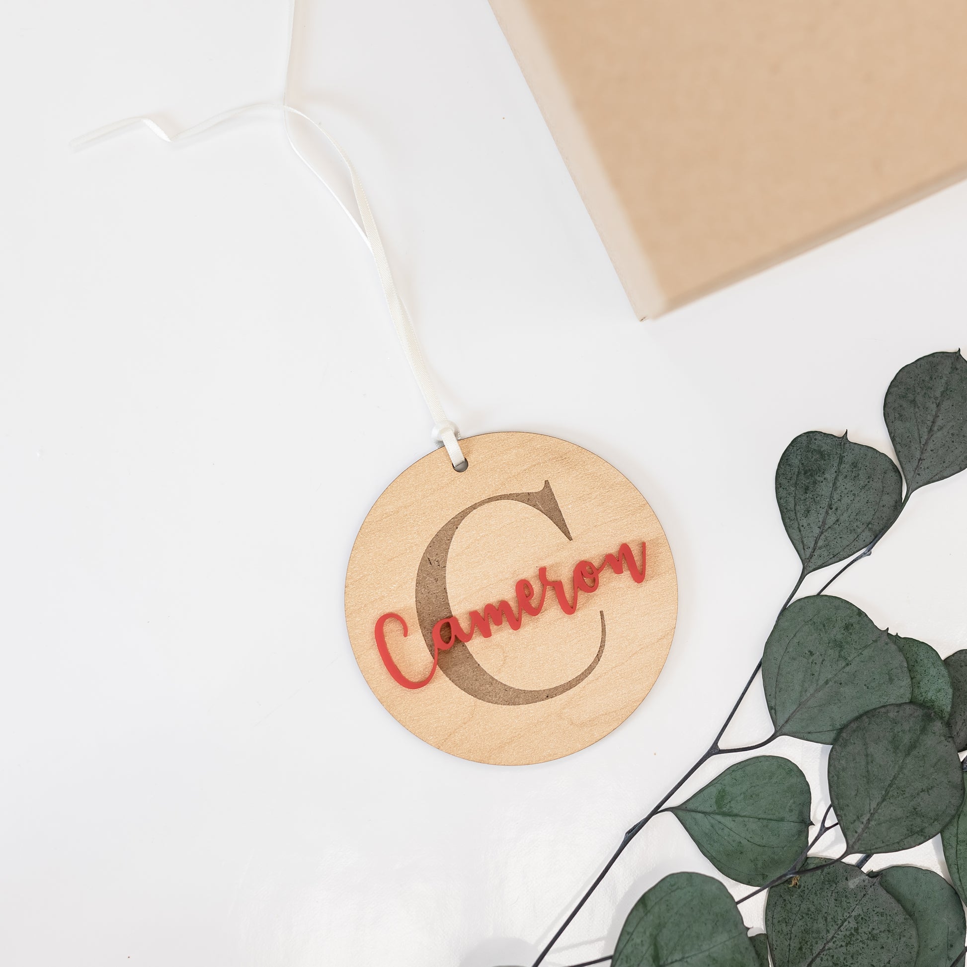 This circular wooden ornament is engrave with a large first initial of the name and features a custom laser cut acrylic cutout affixed to the ornament. 6 colours of acrylic available. Please specify the name to be laser cut out/engraved in the custom notes section.