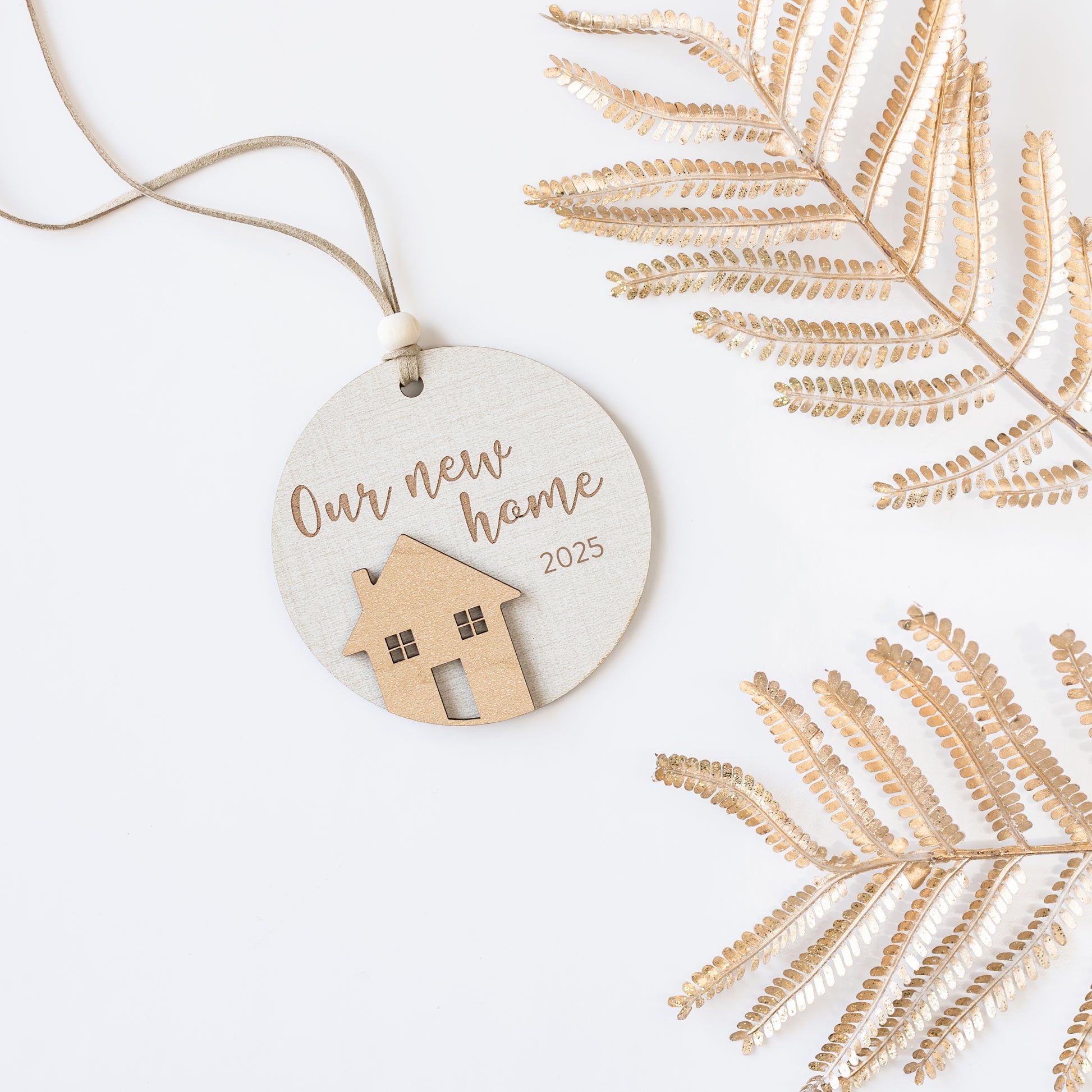 This charming circular ornament features a wooden laser cut home affixed, with engraved text "our new home" and "2024". ("Our" can be changed to "my" upon request).