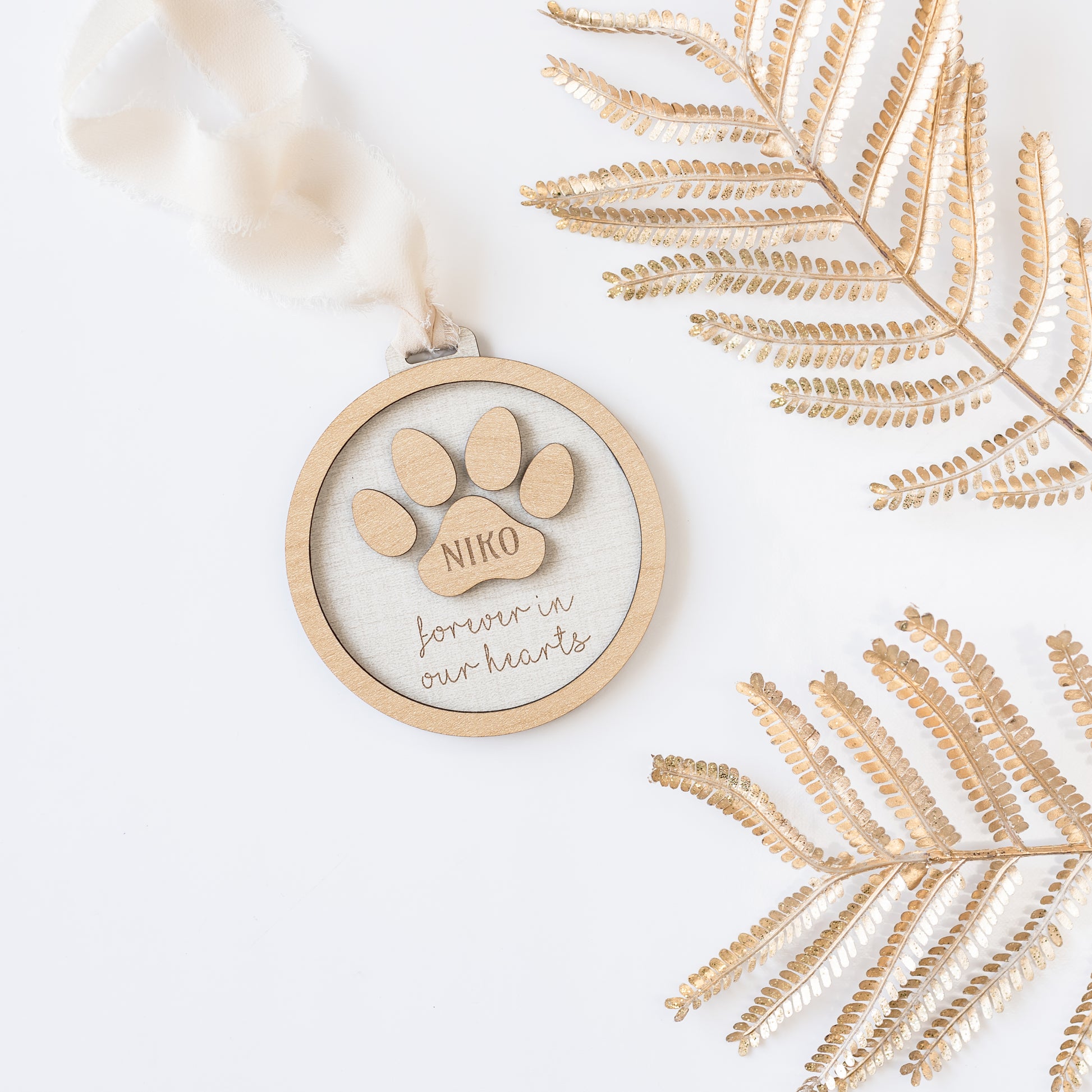This pet memorial ornament is comprised of two layers, with the name of the pet engraved on the paw, which is then affixed to the back layer. "Forever in our hearts" is engraved on the back layer. Paw print can be changed to a cat paw print upon request. Please provide name of pet in custom note section.