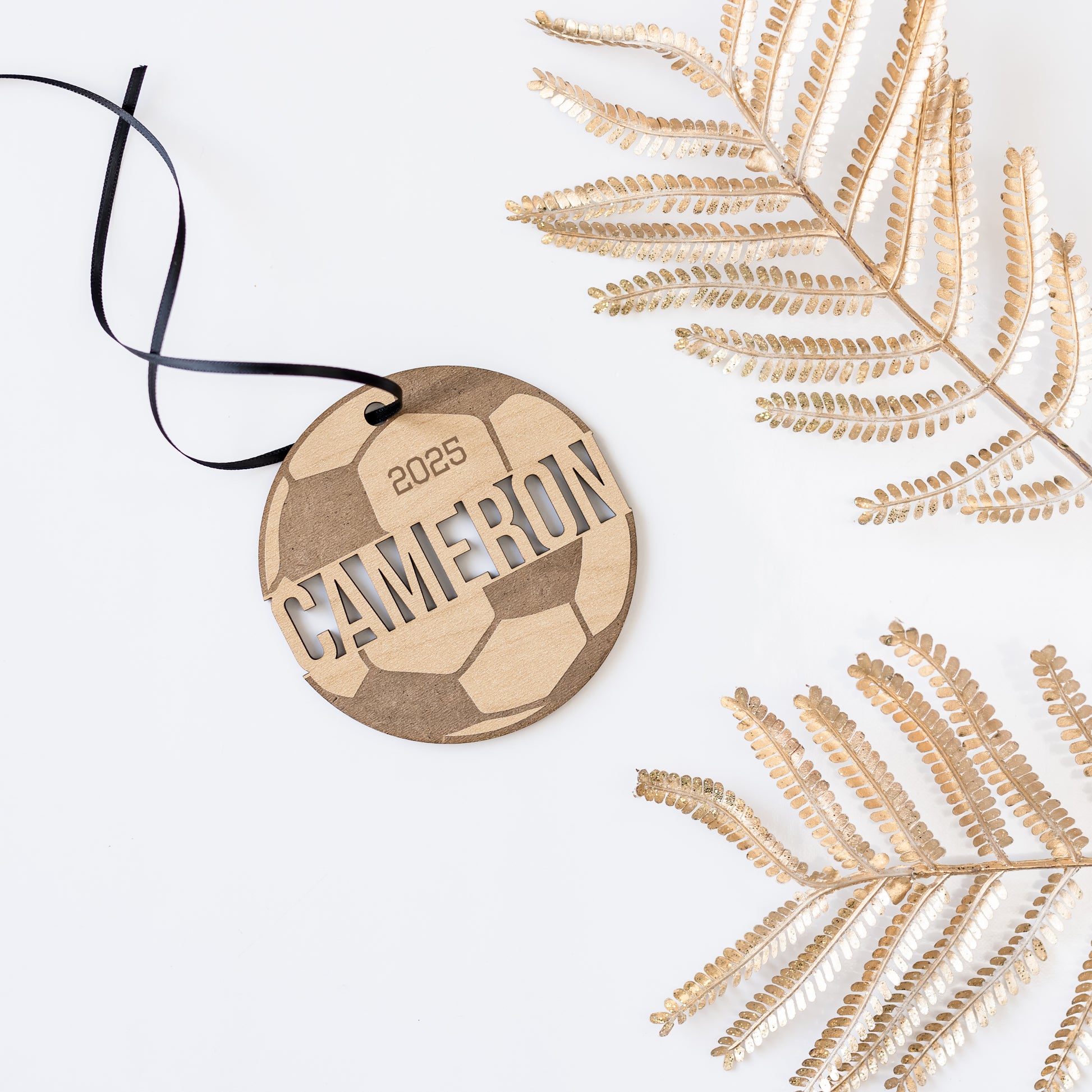 This wooden engraved soccer ball features the name of the child/athlete cut through the middle of the ball and year engraved on the top. Team name can be added upon request. Ribbon colour may be able to be changed to match with team colours (upon request). Please include the name(s) of the athlete(s) in the custom note area.