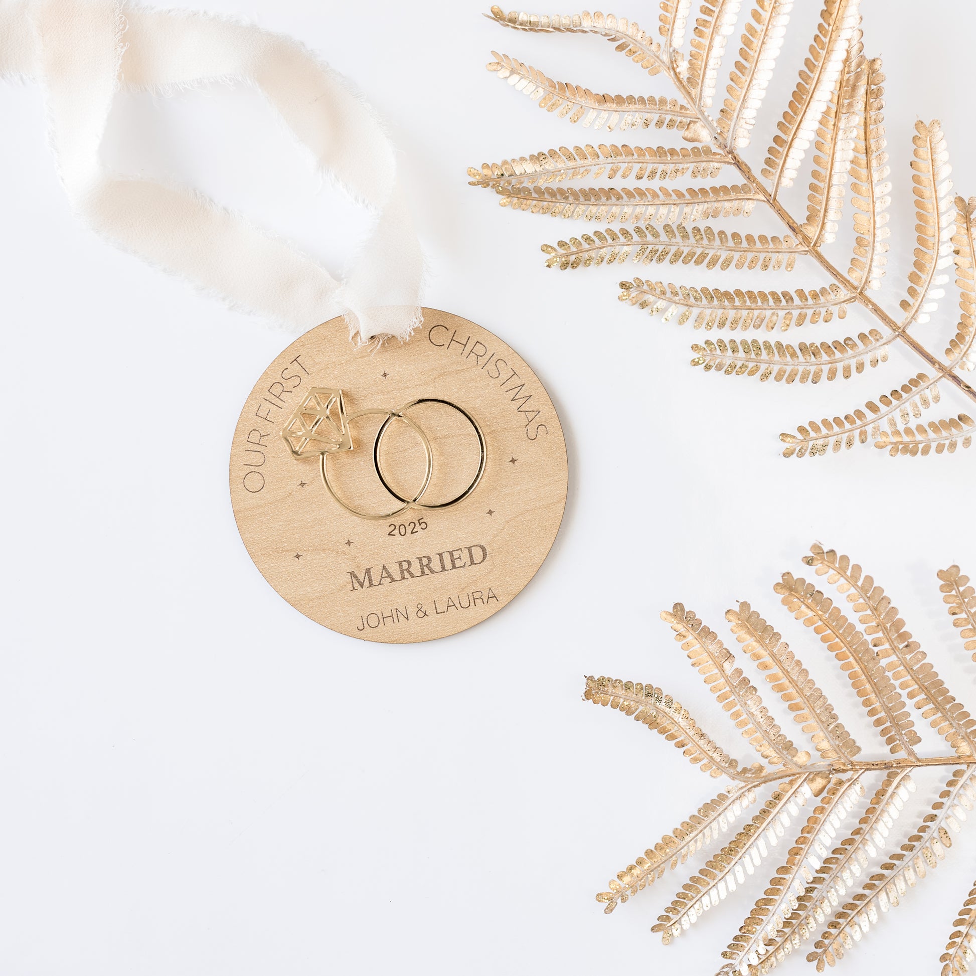 This circular wooden ornament features the text "our first Christmas married" as well as the year, and is the names of the newly married couple custom engraved. Gold mirrored acrylic rings are affixed. Please include the names to be engraved in the custom note section.
